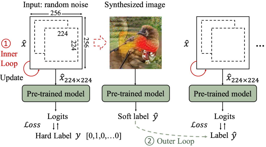整体的生成算法如上图所示:输入一张白噪声图片,在生成过程的每次迭代中,一个 224×224 区域是从 256×256 输入中随机裁剪的,利用通过 loss 计算的导数更新所选区域,直到白噪声收敛成合成图片。然后使用预训练模型对合成图像的预测作为软标签(soft label)来指导下一批从白噪声到图片的生成,从而循环生成 soft-label 和与之对应的图片。