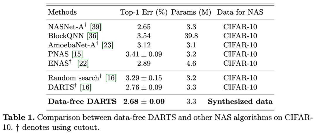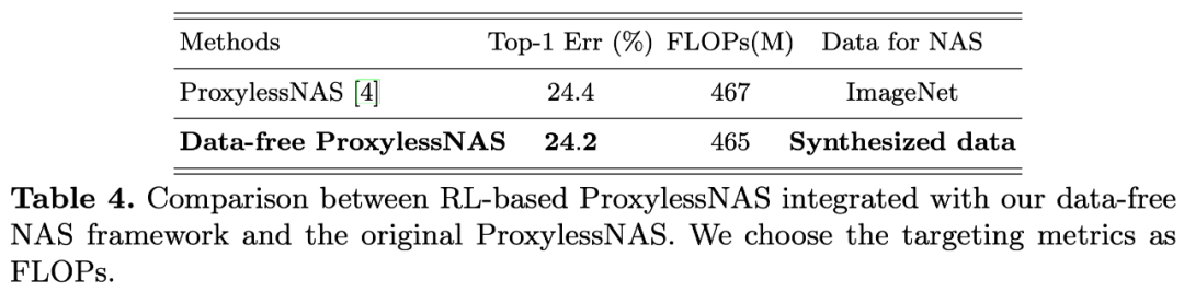 最后,作者用生成图片和生成图片对应的预训练网络预测值来指导 NAS 训练,结合三种常见的 NAS 方法,得到 data-free NAS,包括用基于导数的搜索算法 DSRTS [1],基于遗传算法的 SPOS[2],和基于强化学习算法的 ProxylessNAS[3]。