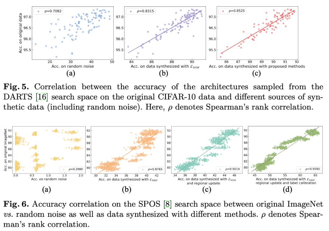 同时,作者做了多组对比实验,来分析生成图片对于 NAS 标定不同网络结构好坏的准确性的影响。通过计算用生成图片训练网络的精度和用真实数据训练的网络精度之间的一致性,作者分析得出,使用所提出的 recursive label calibration 和 regional update 可以大大提高一致性,使得 NAS 更容易搜索得到最优网络: