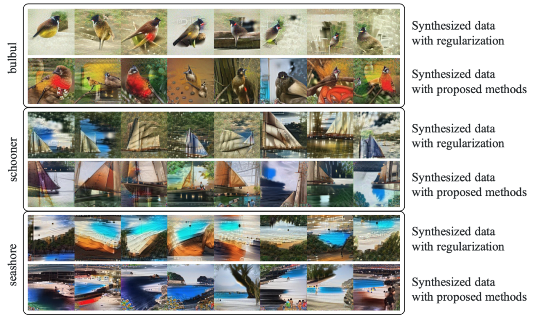 此外,作者提出的区域更新(regional update),即在生成图片过程中,每次仅用导数更新图片的一个区域,比如针对于 ImageNet 数据集的生成数据仅更新 256×256 的图片范围中大小为 224×224 的随机范围。这样保证每一个 224×224 的范围都可以独立成为一幅生成图片,从而配合后续网络训练中用到的随机裁剪(random crop)数据增强算法。