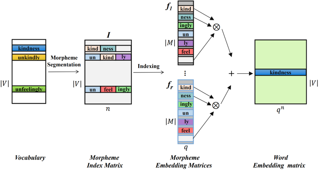 从 r 组参数化的语素嵌入矩阵中索引出相应的语素向量,并通过张量积进行纠缠张量表示得到相应的词嵌入,该过程形式化如下: