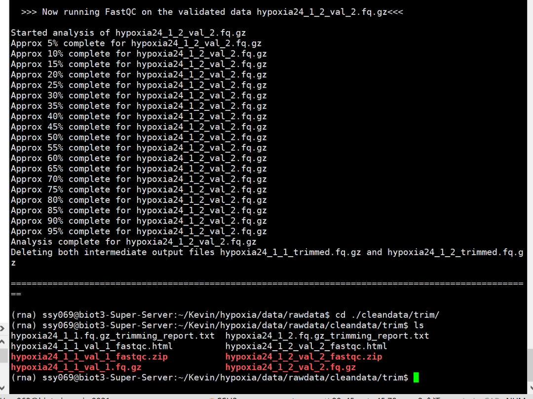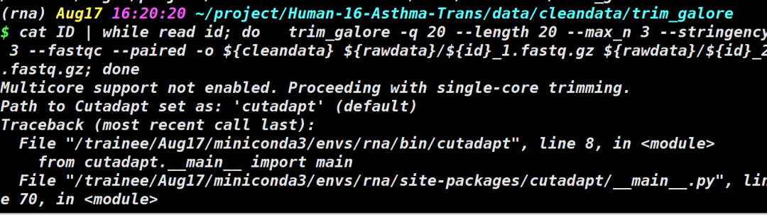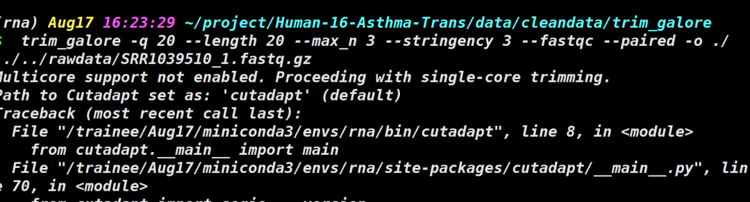 安装trim的时候依赖程序cutadapt没有安装成功,需要卸载trim-galore重新安装