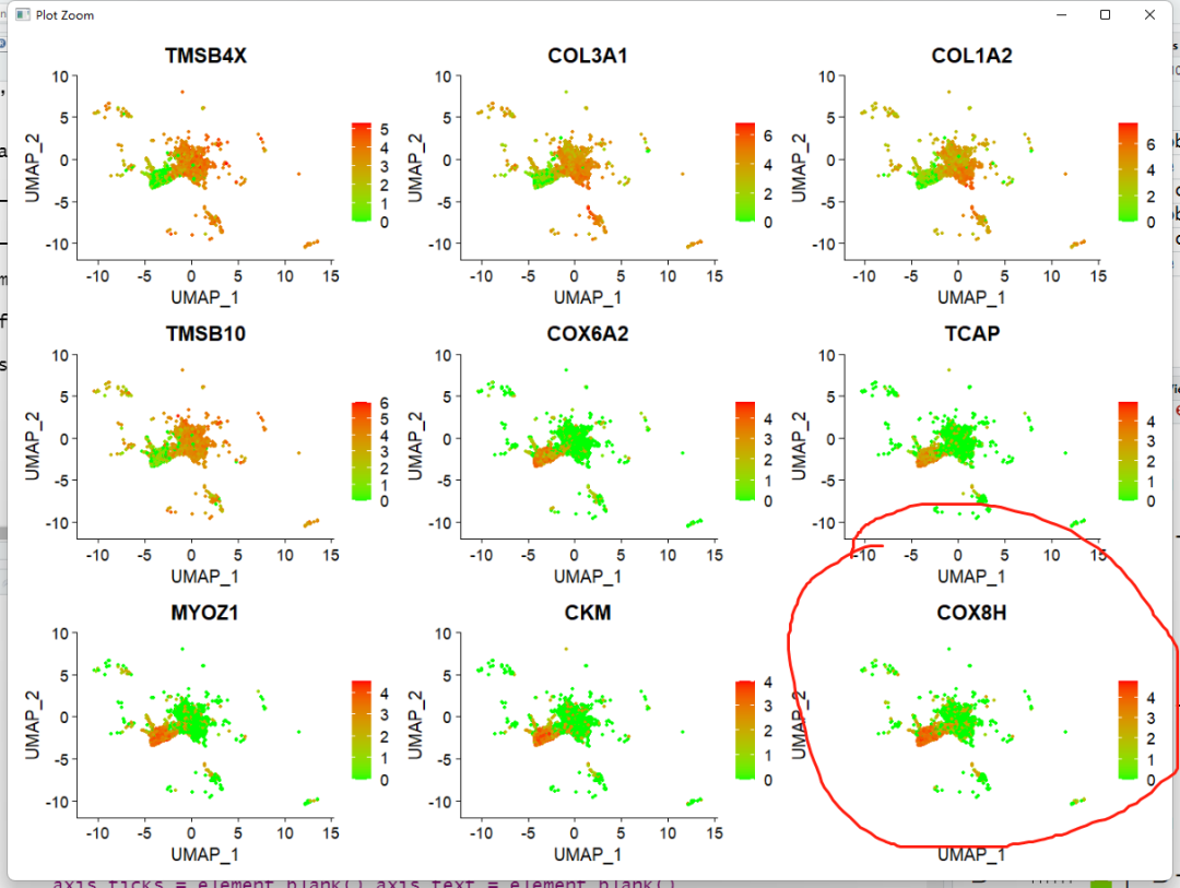 FeaturePlot(sce, features = c("TMSB4X", "COL3A1", "COL1A2", "TMSB10", "COX6A2", "TCAP", "MYOZ1",