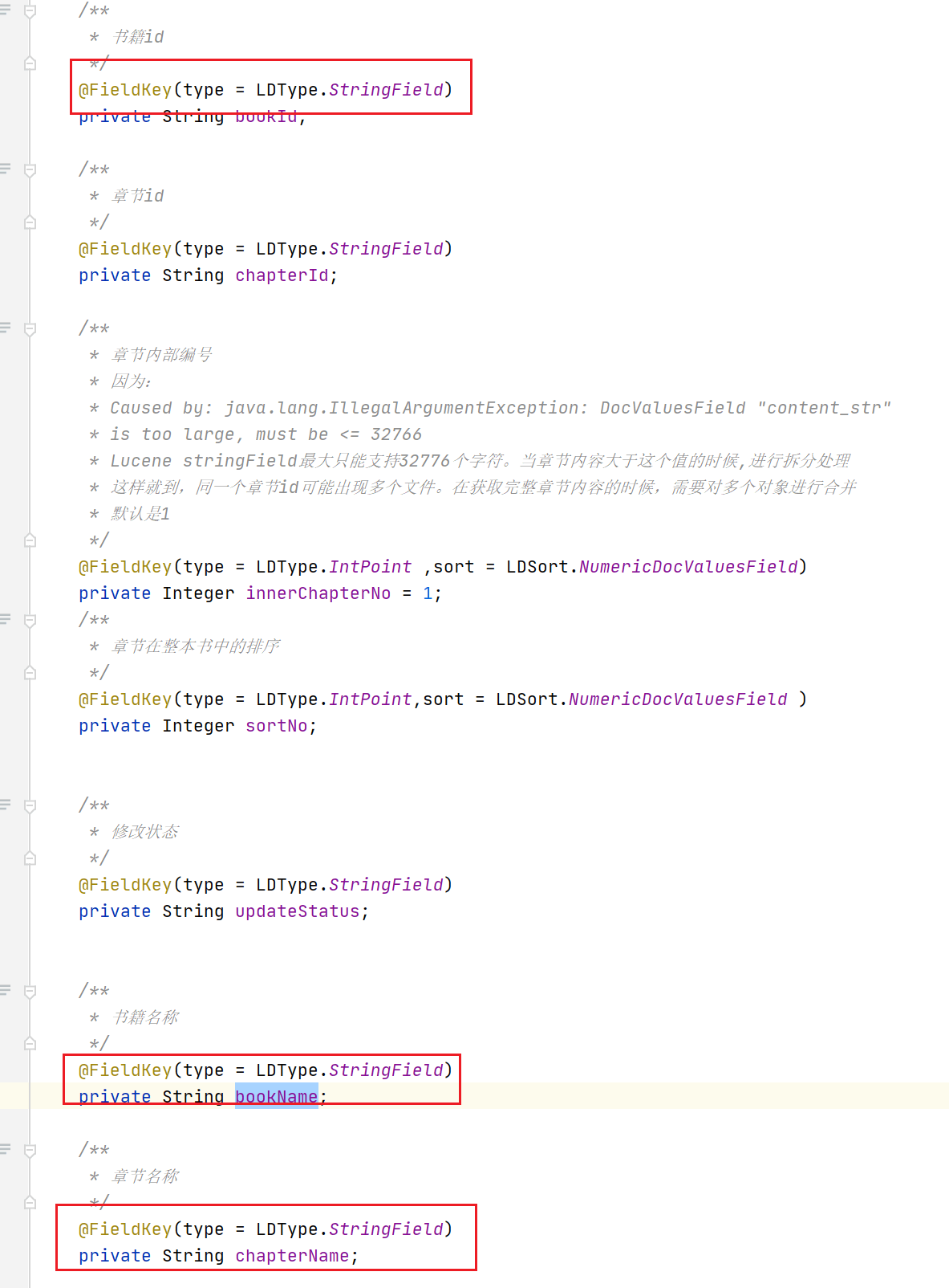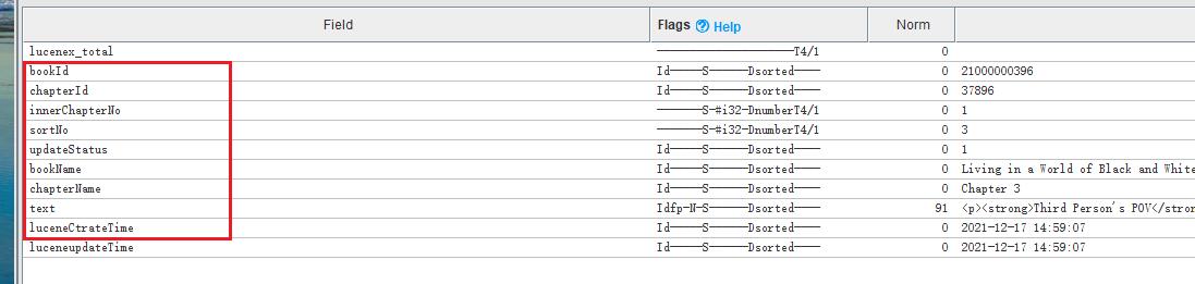 根据sortNo、chapterId、bookId、text都可以查询到。但是根据bookName和chapterName就查不到了 类型都是stringField,这个是为什么?