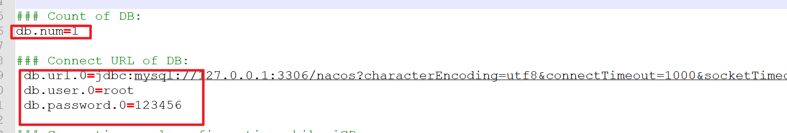 1:db.num这个是被注释掉的。这个必须放开。不然在启动nacos的时候,会提示db.num为null这个错误。