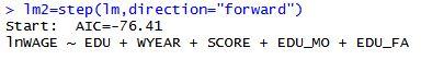 可以求出不同变量之间两两的散布图lm=lm(lnWAGE~EDU+WYEAR+SCORE+EDU_MO+EDU_FA,data=data)#对工资进行多元线性分析Summary(lm)#对结果进行分析可以看到各个自变量与因变量之间的线性关系并不显著,只有EDU变量达到了0.01的显著性水平,因此对模型进行修改,使用逐步回归法对模型进行修改。