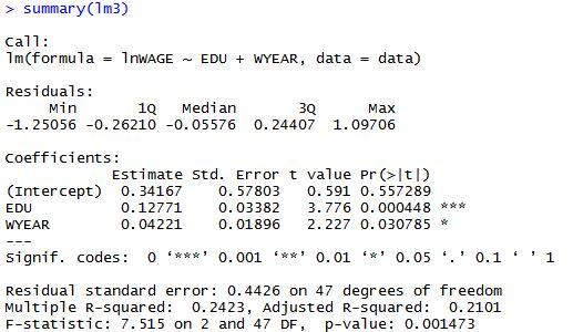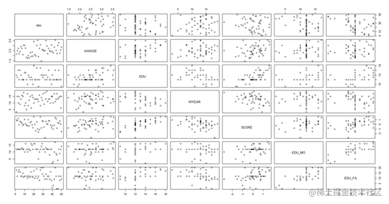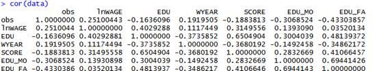 apply(data,2,mean)#计算每个变量的平均值 obs lnWAGE EDU WYEAR SCORE EDU_MO EDU_FA25.5000 2.5380 13.0200 12.6400 0.0574 11.5000 12.1000 apply(data,2,sd) #求每个变量的标准偏差 obs lnWAGE EDU WYEAR SCORE EDU_MO EDU_FA14.5773797 0.4979632 2.0151467 3.5956890 0.8921353 3.1184114 4.7734384cor(data)#求不同变量的相关系数