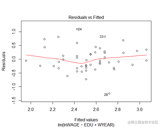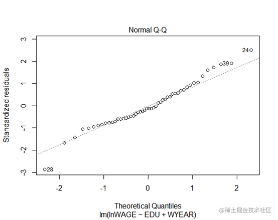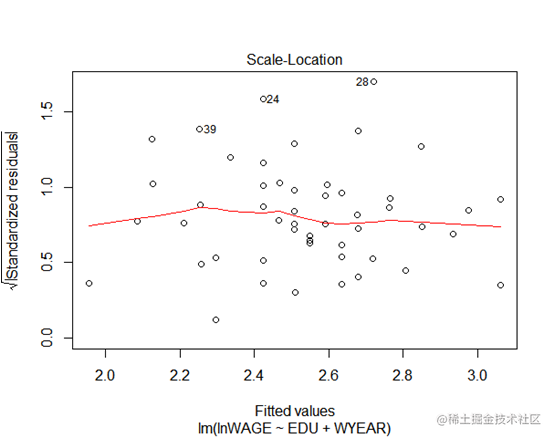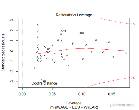 正态qq残差图可以看到标准残差基本上分布在斜线周围,说明样本点满足正态分布。上图说明标准残差也均匀地分布在中间水平线周围。上图从cook统计量的大小我们可以看到有哪些值可能是利群点,其中包括 28 ,39 ,50号样本.`outer=which(residuals(lm2)>=2*var(residuals(lm2)))`#找出模型中残差值大于2倍方差的异常值(即分布不均匀的样本点),将其排除data=data[-outer,]然后进行White检测。