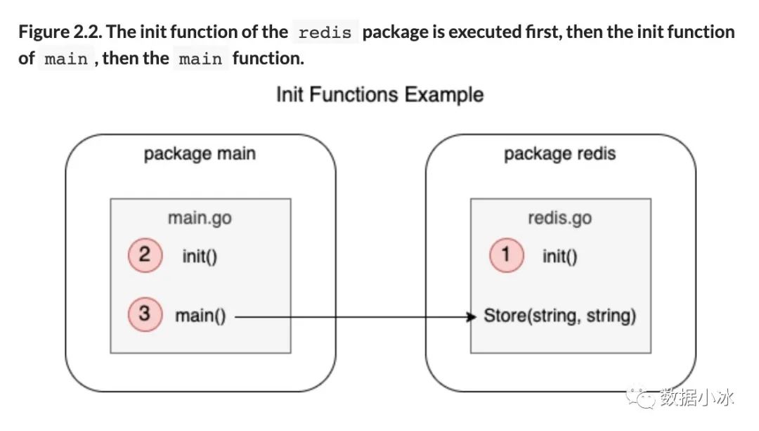 初始化包时会执行init函数。下面的示例将定义两个包:main包和redis包,main包会调用redis包。