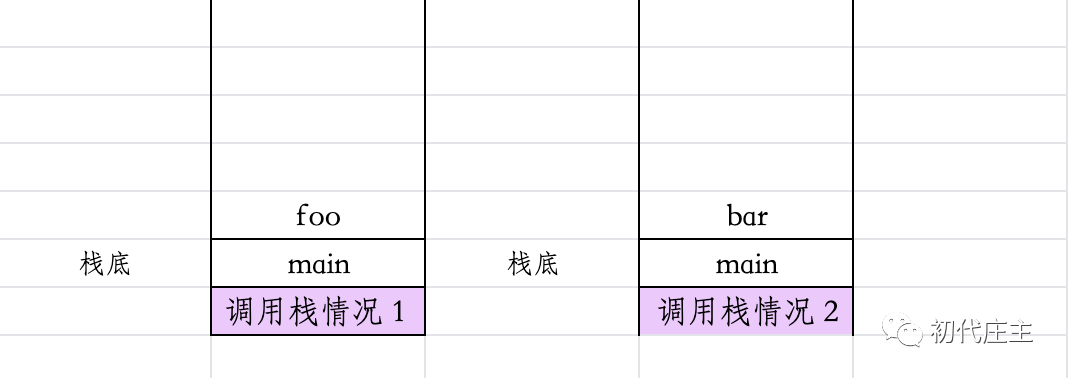 函数的调用在计算机里面是通过压栈来完成的,一个函数执行完成之后就会从栈中弹出,对于我们这个程序的函数调用栈只有以下两种可能。要么它在执行 foo ,要么它在执行 bar 。