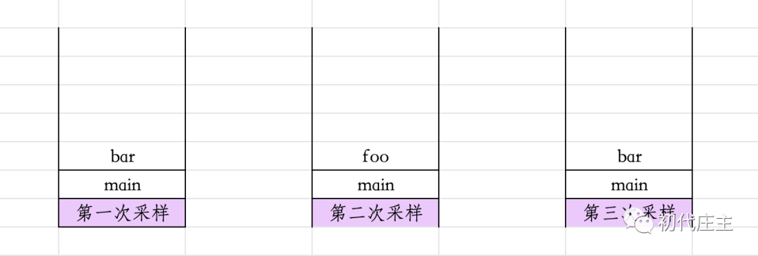 如果在这里直接上火焰图的话,那就是忘了初心了。现在我打算用 excel 手工一步步把画火焰图画出来,假设我们采样了 3 次,那么我们的结果有可能是像下面这样的。