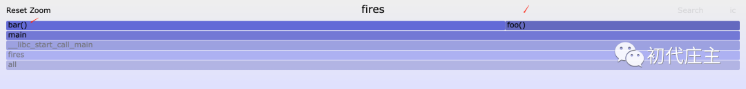 ./flamegraph.pl --color=io --title=fires < /tmp/fires.stack > /tmp/fires.svg3. 由于最终的图片是 svg 格式的,所以用浏览器就能直接看,算比较方便。看 bar 占用 2/3 ,foo 占用 1/3 和我们上面用 excel 画出来的是一个比例。