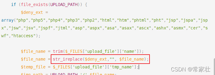 看代码可以看出来它是将上传文件扩展名包含 $deny_ext中的话变成空扩展名也就是没有扩展名,什么意思那看下面的图片展示