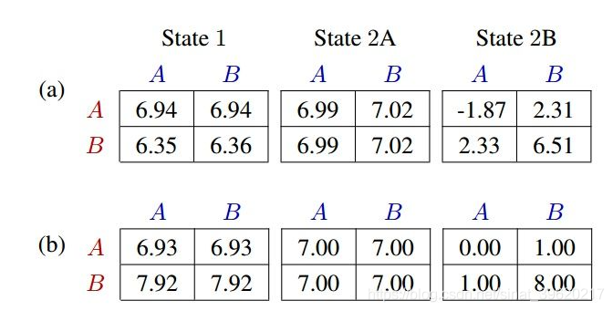 在第一阶段,只有智能体1的动作能决定第二阶段的状态。在第一阶段,如果智能体1采用动作A 则跳转到上图state2A状态,如果智能体1采用动作B则跳转到上图state2B状态,第二阶段的每个状态的价值矩阵如上两图所示。