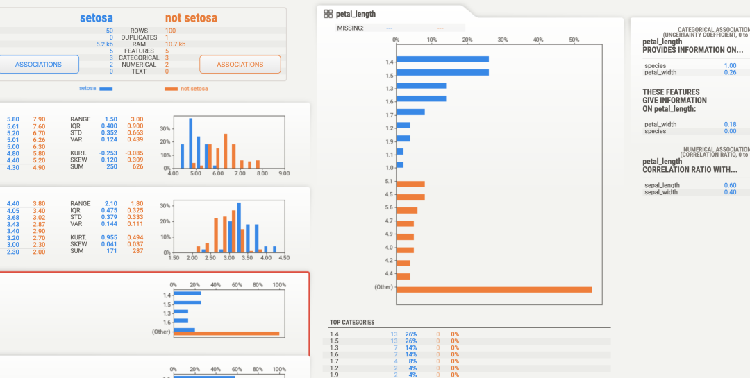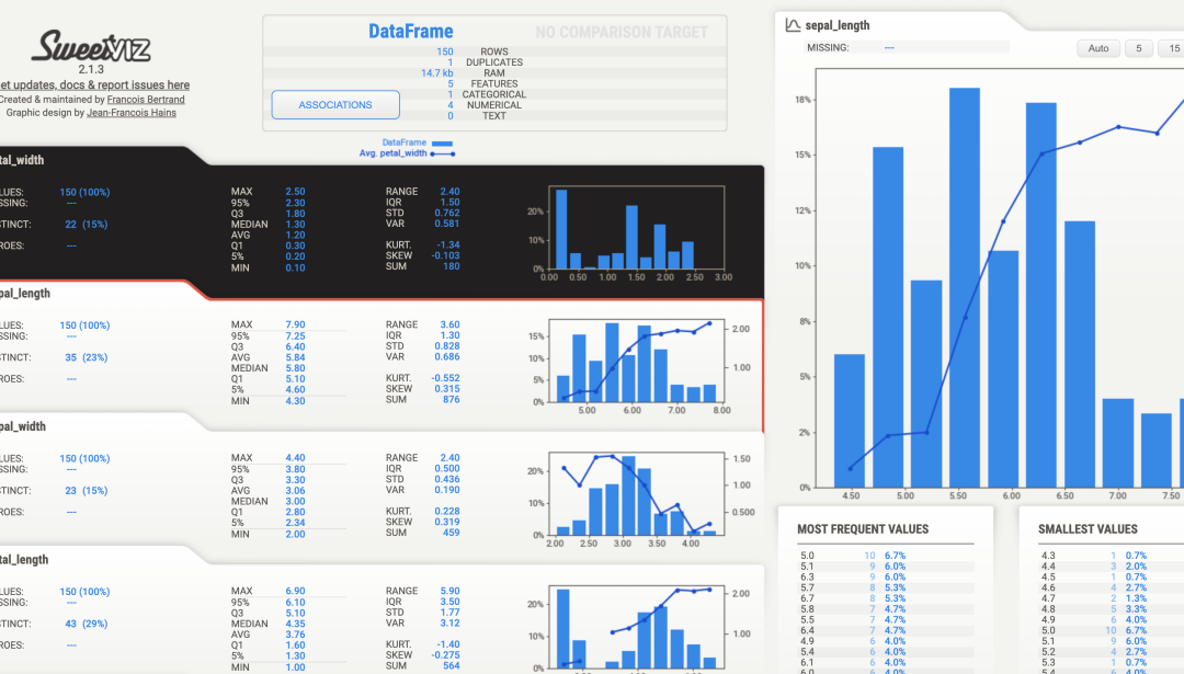Sweetviz与Pandas Profiling类似,提供了每列详细的统计指标、取值分布、缺失值统计以及列之间的相关系数。
