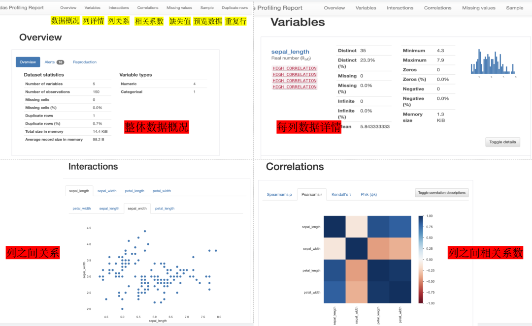 与 PandasGUI 相反,Pandas Profiling没有丰富的图表,但提供了非常多的统计指标以及相关系数。