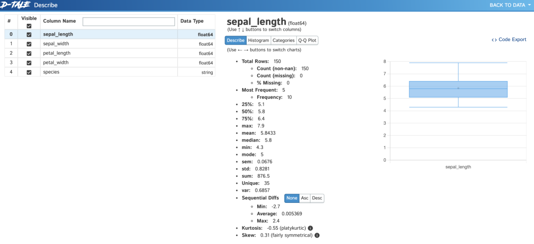最后重磅介绍dtale,它不仅提供丰富图表展示数据,还提供了很多交互式的接口,对数据进行操作、转换。