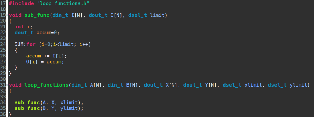 首先,我们对上述代码稍加改造,如下图所示。将for循环封装为一个函数sub_func,这样顶层函数就由两个子函数构成。同样,在默认情况下,Vitis HLS会将这两个函数并行执行。