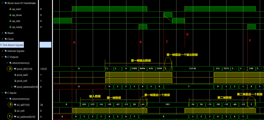 标记1为数组a2对应存储单元的读地址a2_address,共8个数据;标记2显示了读书的数据数值a2_q0,可以看到两者相差一个时钟周期。那么什么时候a2_address可以发生变化呢?我们从标记A可以看到,在标记A左边,ap_idle为高电平,表明该模块处于空闲状态,标记A之后,ap_start为高电平,同时ap_idle变为低电平。一旦ap_start为高,a2_ce0即为高,表明可以开始读取a2对应的数据。当第一帧8个数据读取完毕,即读取到第一帧最后一个数据时,ap_ready为由低电平变为高电平且持续一个时钟周期,表明第一帧输入数据已读取完毕,如图中标记B。紧接着ap_start也由高电平变为低电平。当第一帧计算完毕,输出对应的8个数据后,ap_done由低电平变为高电平并持续一个时钟周期,如图中标记C。当ap_done由高变低时,ap_idle则由低变高,表明可以再次启动该模块。因此,我们可以看到标记D处ap_start为高,之后a2_ce0由低变高开始读取第二帧输入数据。读取到第二帧输入数据的最后一个数据后,ap_ready由低电平变为高电平。