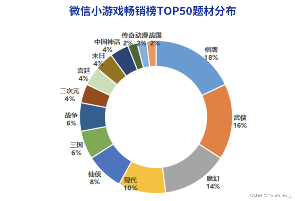 从题材上看,棋牌、武侠、魔幻占比高。其中棋牌品类优势明显,占比约18%。这主要得益于微信生态中较强的社交属性和国内规模较大的用户人群。