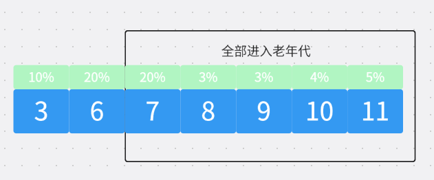 当survior区域的存活对象的总大小占用了survior区域大小的50%(可以通过参数指定),那么此时将按照这些对象的存活年龄从从到大排序,然后依次累加,当累加到对象大小超过50%,则将大于等于当前对象年龄的存活对象全部挪到老年代。