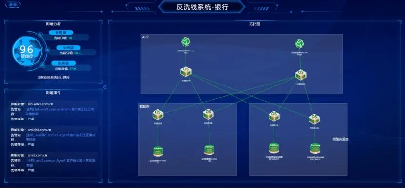 乐维监控支持将关键的业务系统配置到全景业务墙上,通过对每个业务系统下钻,用户可查看到对应的的整体业务状态,包括业务拓扑图、健康度影响分析、影响的告警事件,方便用户了解业务系统的物理层、中间层、应用层实际运行状况,做好关键业务系统的优化、保障工作常态化开展。