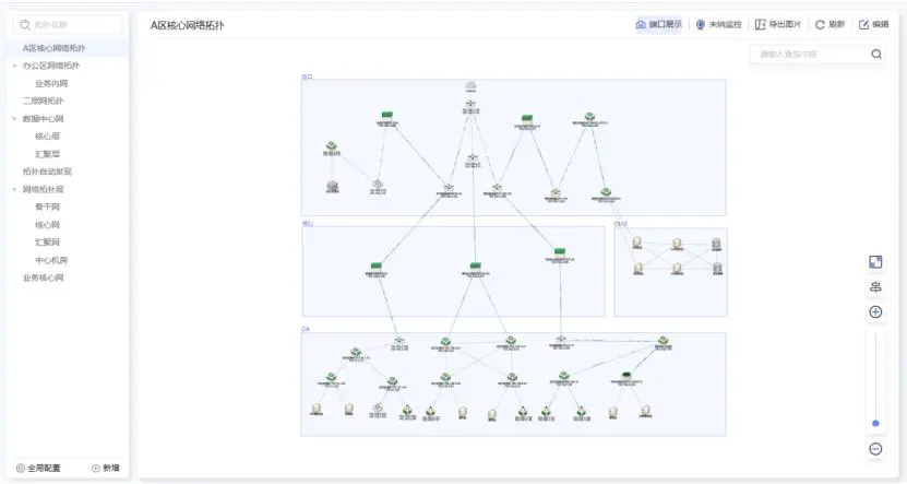 当前拓扑会对所有拓扑对象进行周期性的告警获取,如果存在告警,拓扑的对象会按照告警的级别进行特定颜色闪烁,双击鼠标即可查看告警列表;正常情况下拓扑链路可以双击鼠标查看链路信息,包括端口、端口状态、上下行端口宽带利用率及查看链路告警等信息,且支持线路繁忙时呈不同颜色显示(绿-橙-红),线条粗细随着总带宽大小不同而变化。