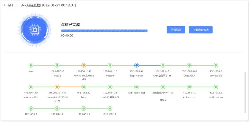 3、巡检过程记录:支持图形化方式查看巡检过程记录,异常对象需按照告警等级颜色展示;