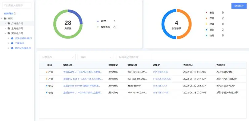 乐维监控能够以树形关系展示系统内的资源,通过资源占比环形图、告警总数环形图、告警信息列表直观展现整体的业务资源监控情况。