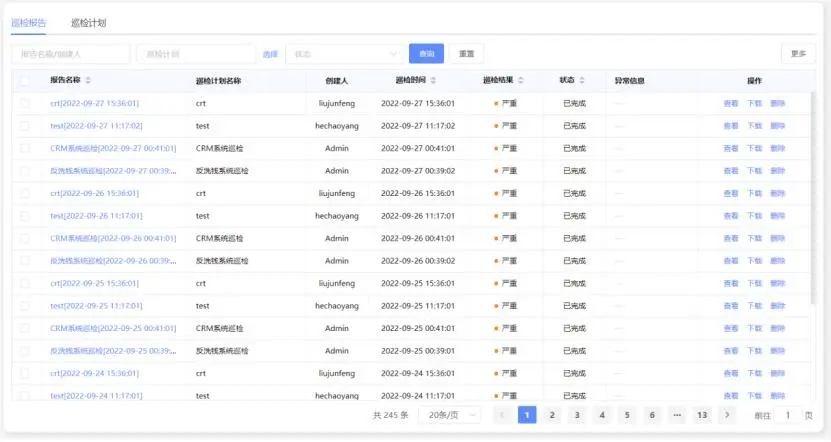 ●巡检报告管理:提供统一的报告管理界面,按业务系统展示业务状态、业务告警情况,同时支持填写巡检结论及结果导出。