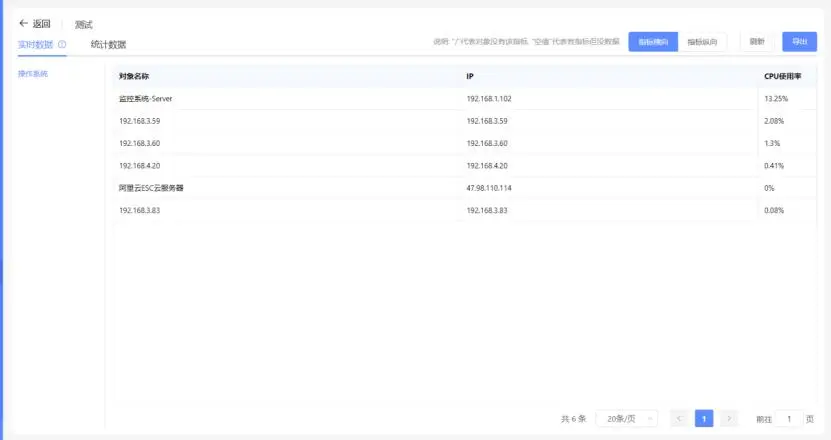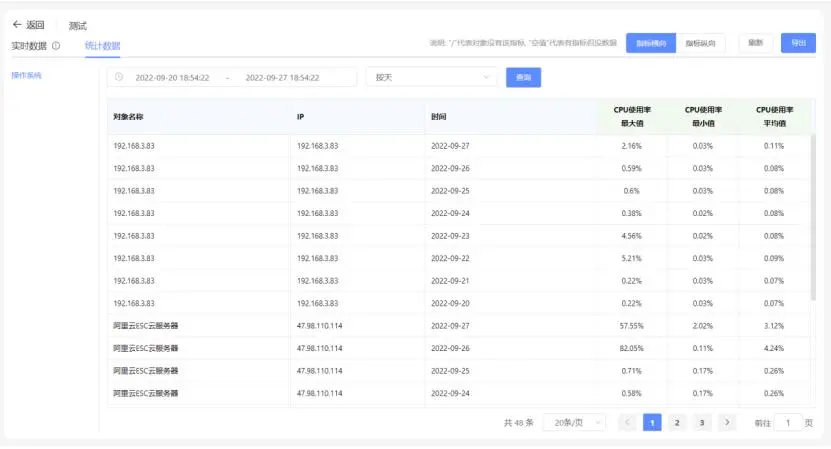 3、以表格方式呈现最新实时指标数据,同时提供指标的最小值、平均值、最大值;