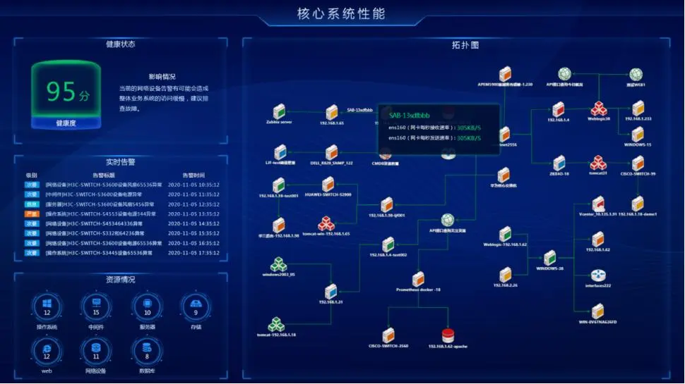 1.拓扑对象支持按照告警级别进行特定颜色闪烁,可下钻查看告警详情及对象详情。