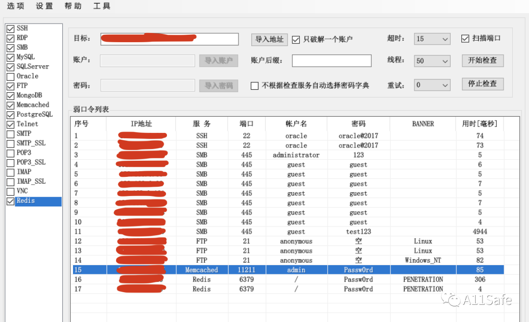 配置 socks 代理后使用超级弱口令扫描工具扫描内网中存在的弱口令
