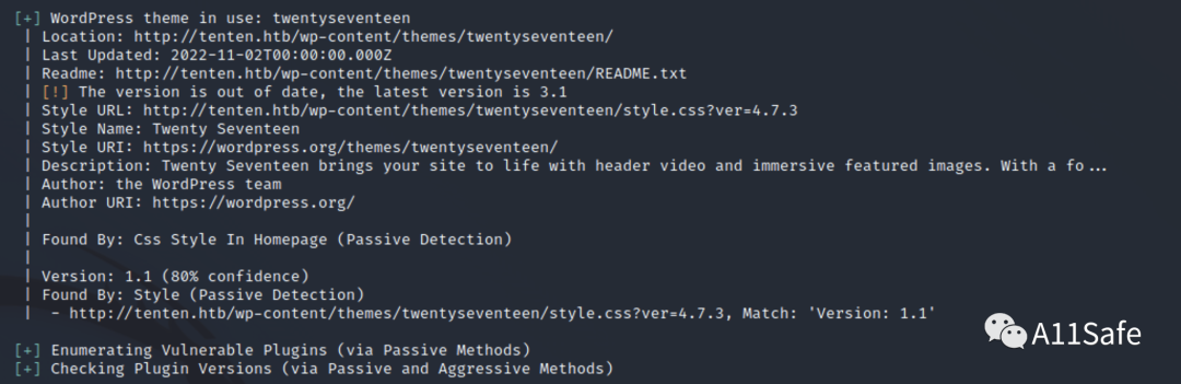 使用 wpscan 对 WordPress 模版进行专项扫描,结果显示 WordPress 主题为twentyseventeen