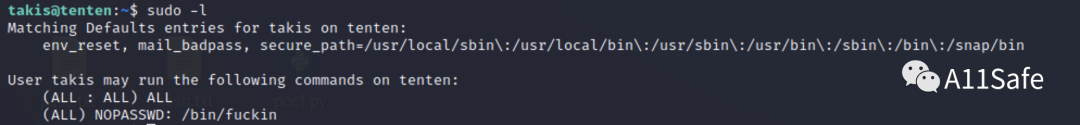 检查当前用户sudo权限,结果显示可使用 sudo 命令执行任意超级用户的权限,但前提是需要拥有当前用户的密码,只有以 sudo 运行/bin/fuckin时无需输入密码