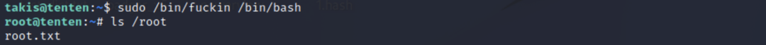 由于 sudo 运行fuckin无需密码,因此输入命令id可查看当前权限为 root