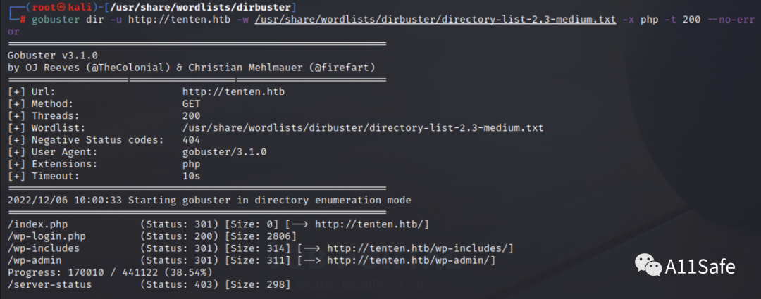 使用 gobuster 对站点进行目录扫描,结果中只包含了 WordPress 的常见目录及文件