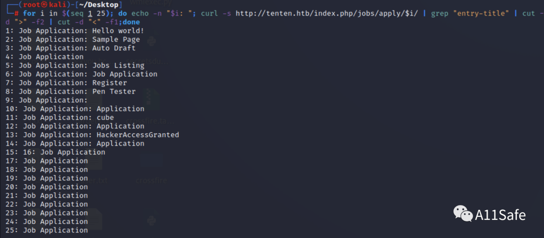 for i in $(seq 1 25); do echo -n "$i: "; curl -s http://tenten.htb/index.php/jobs/apply/$i/ | grep "entry-title" | cut -d ">" -f2 | cut -d "<" -f1;done