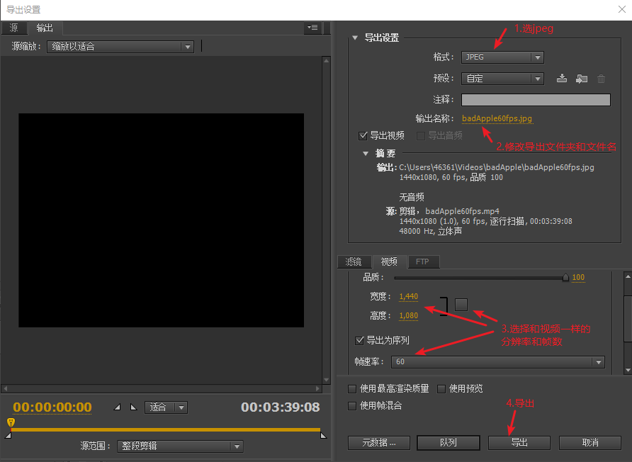 2.按ctrl+m导出为jpg图片,记得存进一个文件夹里,因为会导出大量图片,例如一个三分多钟六十帧的badApple就有一万三千多帧。