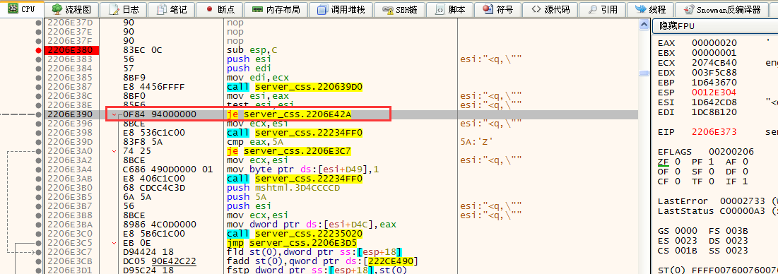 6.直接【F8】单步到返回到上一层,此处【2206e390】的JE改为jmp直接跳过,即可实现子弹加速。