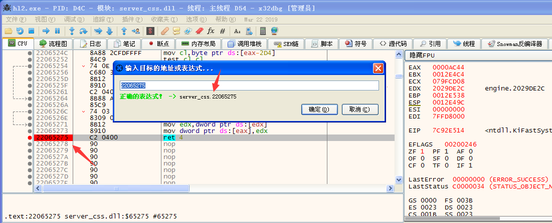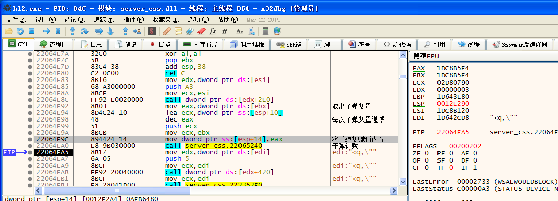 5.回到游戏开一枪,x64dbg会断在【22065275】地址上,经过分析这层没有关键的东西,我们取消此处的断点并向上返回一层