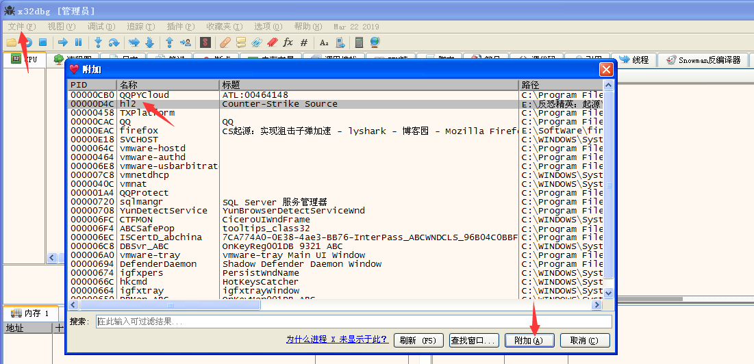 4.在调试器中点击【符号】并双击 【hl2.exe】跳到程序领空,在程序领空按下【Ctrl +G】并输入刚才得到的内存地址。