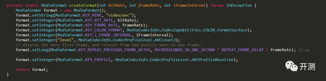 其中profile_idc等于100表示码流是High档次,profile_idc等于66表示码流是baseline档次。码流的取值是由手机硬件决定的。通过阅读scrcpy源码发现ScreenEncoder文件中有个createFormat私有方法可以指定视频流数据的格式,因此我们修改该方法的代码,人为的将视频流数据格式化为baseline,具体代码如图2所示。