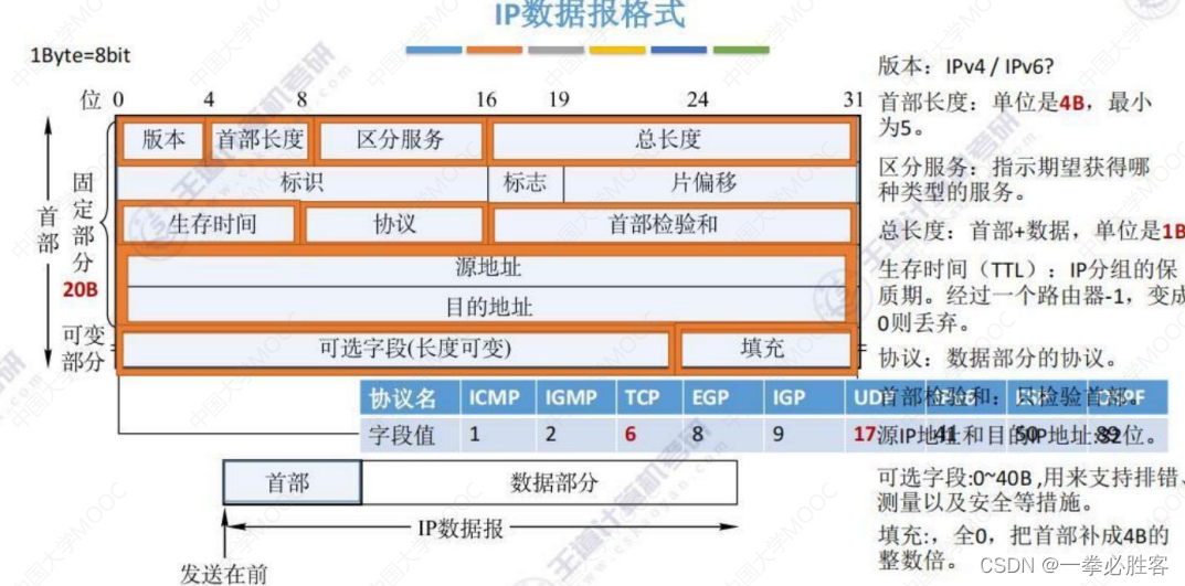 版本4位-------ipv6?v4 首部长度4位-------0-15--------单位是4B------如果是5那么就是20B------0101---------------有填充字段来保证是4B的倍数