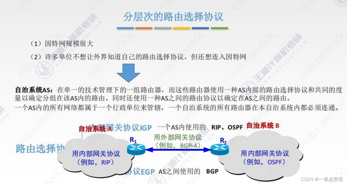 一个AS内的所有网络都属于一个行政单位来管辖-------一个自治系统所有路由器在本自治系统内必须联通-----------------自己的小区