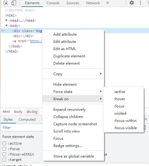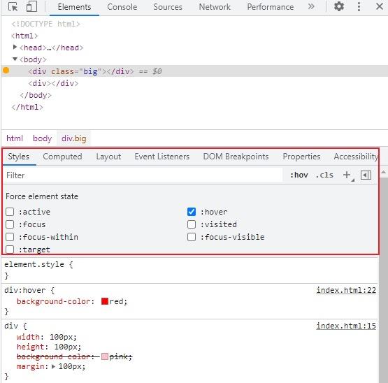 5. 伪类选择器样式修改: 1. 在 Elements 中找到对应元素,右键选择 Force state,再选择伪类,如:hover,即可强制变样式,而伪类样式也可在 Styles 下进行修改