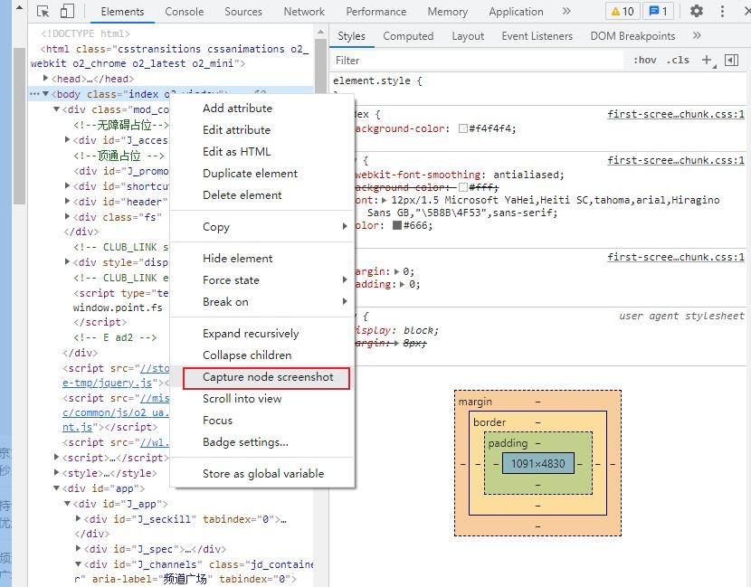 用上诉方法选中元素(节点),在 Elements 面板右键,选择下图红框即可截图